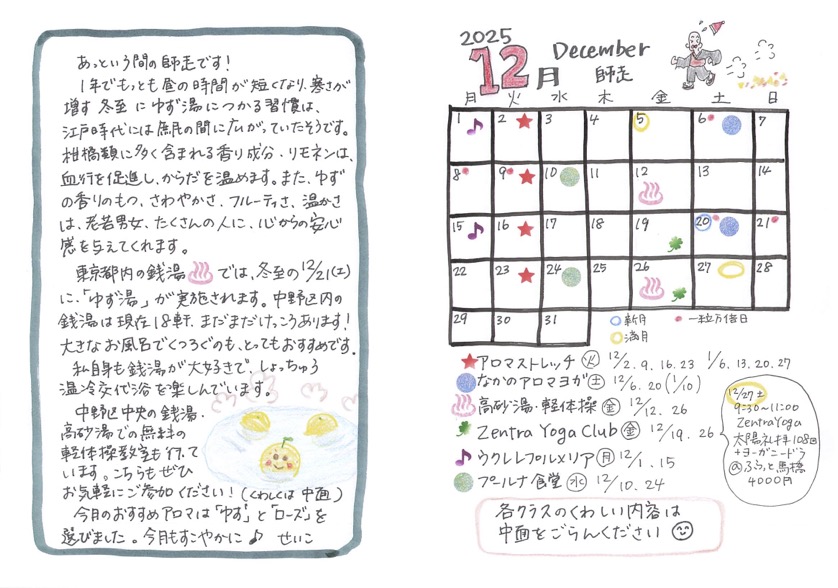私は中野区の「いきいき入浴・はつらつ事業」という取り組みで、銭湯♨️での無料の体操教室を行っています。私自身も銭湯がとても好きで、しょっちゅう行って温冷交代浴を楽しんでいます。東京都内の銭湯では、冬至の12月21日(土)に「ゆず湯」が実施されます。中野区内の銭湯は現在18軒、まだまだけっこうあります! 大きなお風呂でくつろぐのも、とってもおすすめです!